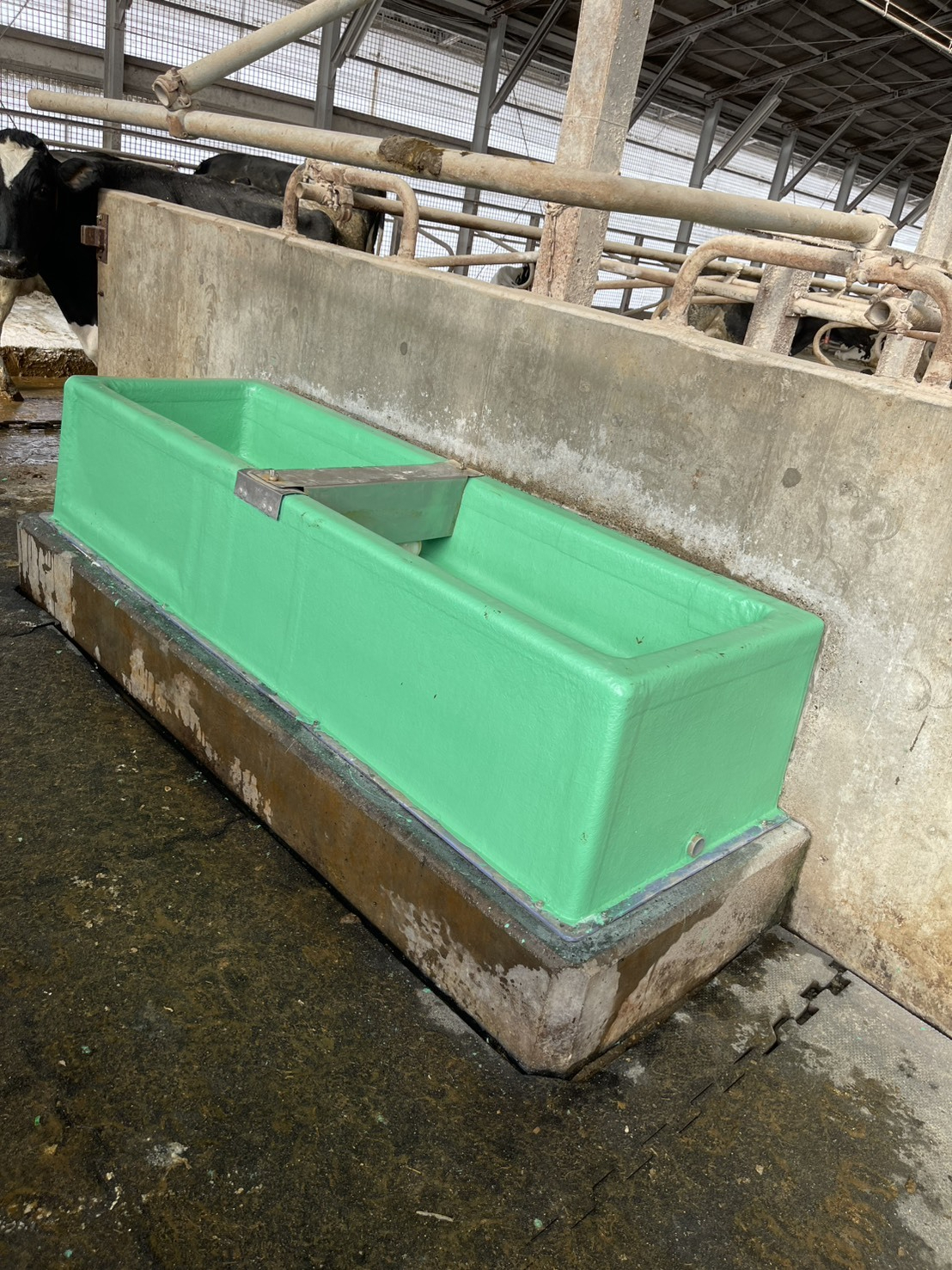 飼槽に施工すれば衛生的で牛たちが餌の食いも良くなり残飼も減り、清掃等の負担軽減・時間短縮になります。